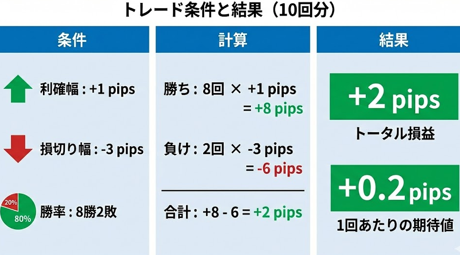 トータル損益は+2pips(10回分の期待値)となり、1回あたりの期待値は +0.2pips です。