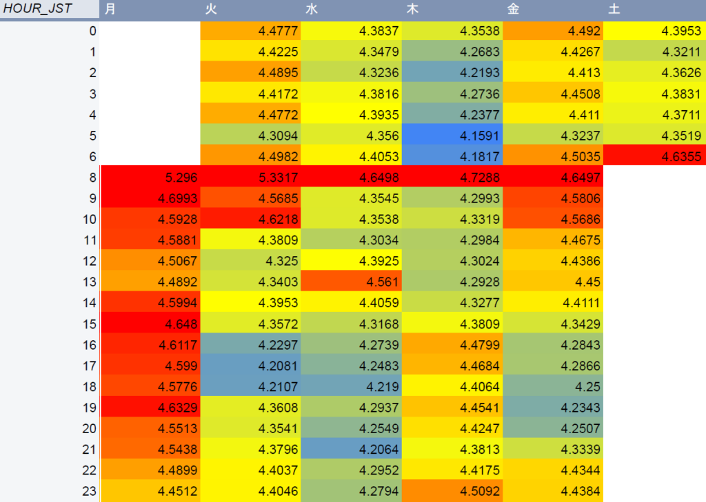 - 土曜日早朝のデータは参考値として集計していますが、週末クローズ前のため本記事の分析対象からは除外しています