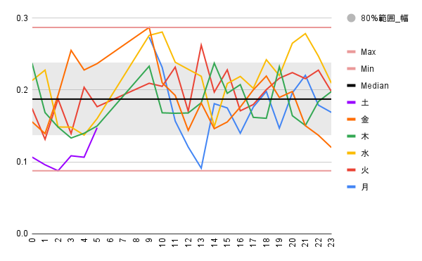 | 月 | 12:00〜16:00(特に13時台) | 0.09〜0.14付近が多く、最も安定。7〜8時は危険。 |